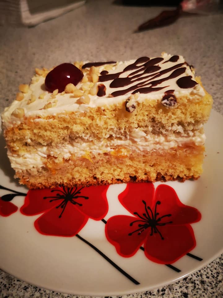 Biskvitinis desertas su grietinėle, kondensuotu pienu ir varške