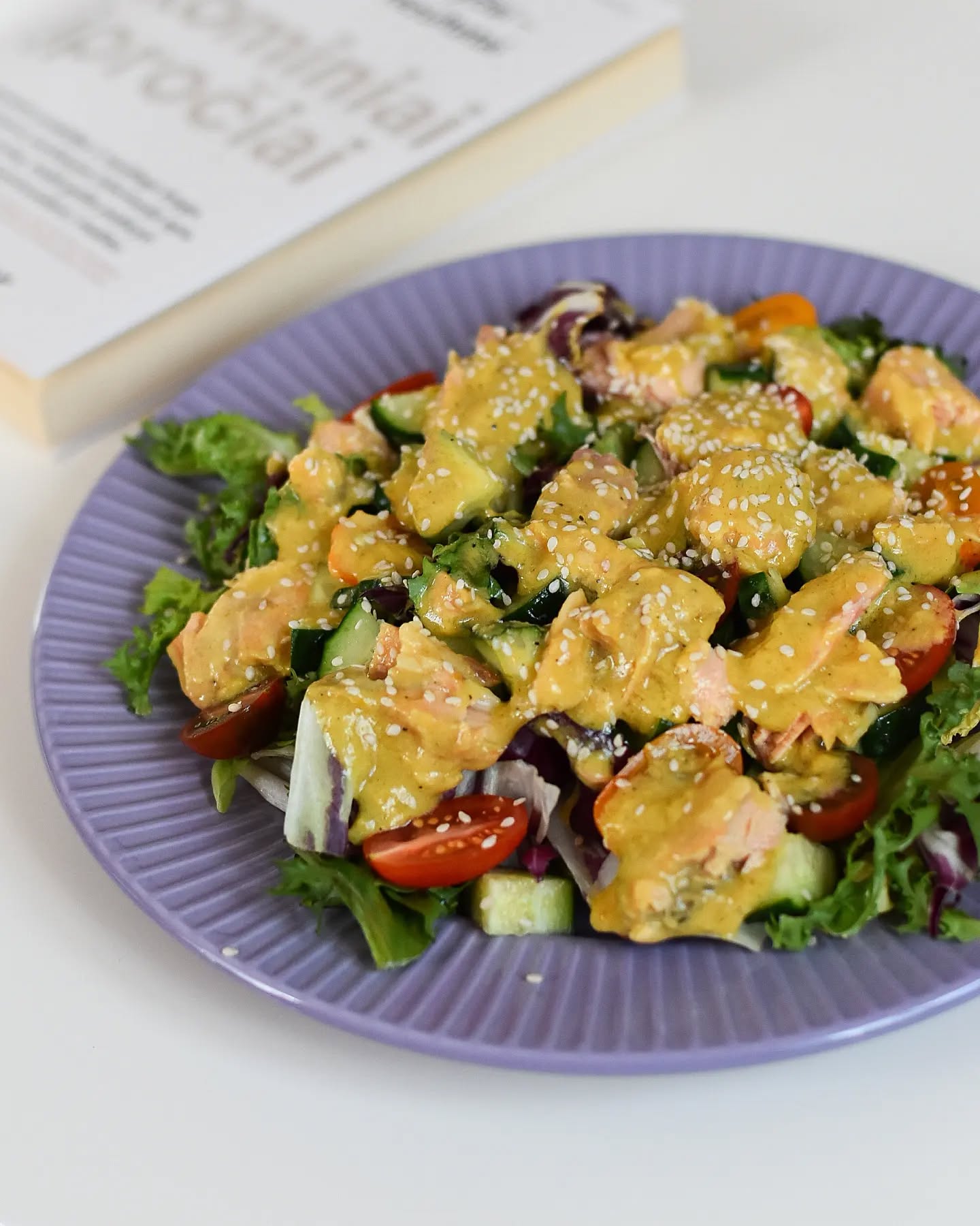 Gaivi mišrainė su lašiša Kūčioms yra tas patiekalas, kuris per kelias minutes sukuria šventišką nuotaiką ir kartu neapsunkina stalo. Lengvos salotos su traškiais agurkais, salotų lapais ir vyšninių pomidorų saldžiarūgščiu gaivumu puikiai dera su švelnia lašiša, o mangų-garstyčių padažas suteikia subtilų šventišką akcentą. Kūčių vakarui toks derinys ypač tinkamas, nes žuvis tradiciškai užima svarbią vietą lietuviškuose Kūčių patiekaluose, o mišrainė atrodo elegantiškai ir moderniai.