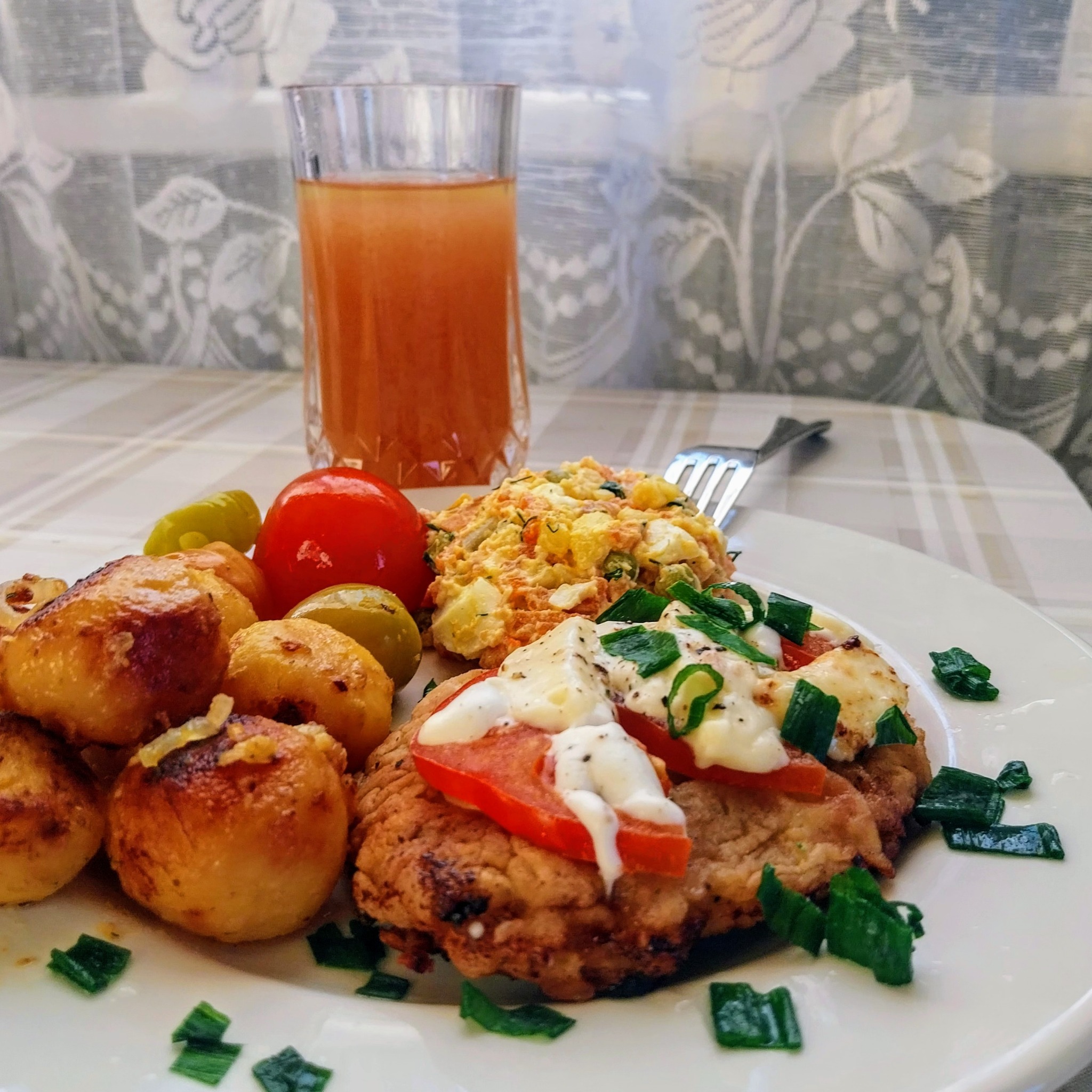 Patiekimas: Į lėkštę dedu po nugarinės kepsnį su pomidorais, svogūnais ir sūreliu, šalia patiekiu keptas bulvytes, kaušelį baltos mišrainės ir kelis švelniai marinuotus pomidorus. Ant viršaus pabarsčiau smulkintų žaliųjų svogūnų laiškų, o prie pietų labai tinka namų pomidorų sultys.