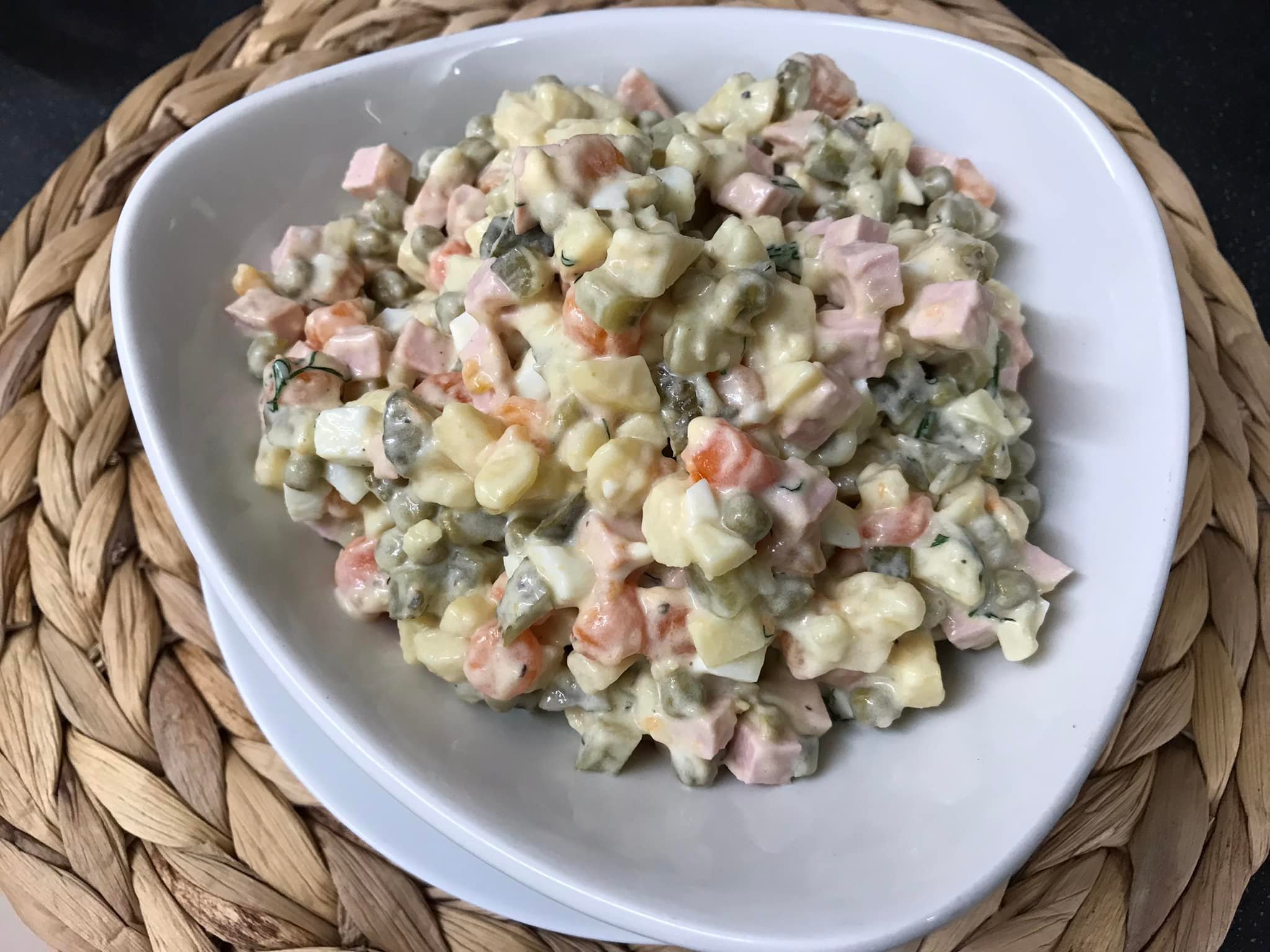 Man ši balta mišrainė su dešra yra tikras “namų skonis”. Ją pirmą kartą kruopščiai mokiausi gaminti stebėdama mamą, kuri visada kartodavo, kad mišrainės sėkmė priklauso nuo dviejų dalykų: tinkamai atvėsintų ingredientų ir kantrybės pjaustant vienodus kubelius. Šį receptą esu ne kartą tikrinusi per šeimos šventes ir paprastus vakarienės vakarus, todėl drąsiai sakau, kad proporcijos patikrintos, o skonis stabiliai pavyksta net tada, kai tenka improvizuoti su turimais produktais.