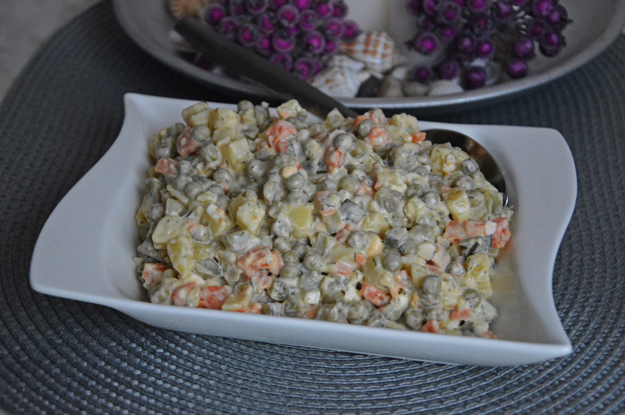 Jeigu norite ypač dailios, „restoraninės“ tekstūros, dalį bulvių kubelių labai lengvai paspaudžiu šaukštu prieš maišydama. Tuomet padažas natūraliai sutirštėja, o tradicinė balta mišrainė tampa kremiška net ir naudojant mažiau majonezo.